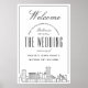 Saudações aos bons que viajaram de perto e longe para vir à sua cerimônia de casamento com esta adorável poster! É certo colocar um sorriso no rosto enquanto eles caminham na igreja, salão de baile, ou locais de sua cerimônia, e servem como uma apreciação da sua presença. O poster de boas-vindas ao casamento, ao estilo deco moderno e divertido, é especificamente adaptado a um casamento que acontece na maravilhosa cidade de Baltimore, Maryland. Apresenta uma grande saudação de boas-vindas em direção ao topo e uma ilustração estilizada do horizonte único da cidade descendo em direção ao fundo. No meio, sua informação do dia do casamento, incluindo a data, a cidade, e os nomes do adorável casal casado.