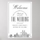 Saudações aos bons que viajaram de perto e longe para vir à sua cerimônia de casamento com esta adorável poster! É certo colocar um sorriso no rosto enquanto eles caminham na igreja, salão de baile, ou locais de sua cerimônia, e servem como uma apreciação da sua presença. A poster de boas-vindas ao estilo deco moderno e divertido é especificamente adaptada a um casamento que acontece na bela cidade de Pittsburgh, Pensilvânia. Apresenta uma grande saudação de boas-vindas em direção ao topo e uma ilustração estilizada do horizonte único da cidade descendo em direção ao fundo. No meio, sua informação do dia do casamento, incluindo a data, a cidade, e os nomes do adorável casal casado.