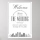 Saudações aos bons que viajaram de perto e longe para vir à sua cerimônia de casamento com esta adorável poster! É certo colocar um sorriso no rosto enquanto eles caminham na igreja, salão de baile, ou locais de sua cerimônia, e servem como uma apreciação da sua presença. O poster de boas-vindas ao casamento, ao estilo deco moderno e divertido, é adaptado especificamente a um casamento que acontece na bela cidade de Houston, Texas. Apresenta uma grande saudação de boas-vindas em direção ao topo e uma ilustração estilizada do horizonte único da cidade descendo em direção ao fundo. No meio, sua informação do dia do casamento, incluindo a data, a cidade, e os nomes do adorável casal casado.