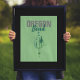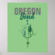 Poster de arte moderna mostra Oregon em cinza angustiada com Bend em um script aqua moderno com árvores geométricas e logotipo de planetas gráfico em fundo verde