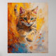 This vibrant artwork captures the raw energy and elegance of a Bengal cat mid-leap. With its striped coat, piercing green eyes, and extended paws, the feline bursts forward through a swirl of earthy tones and expressive brushstrokes. The abstract background enhances the sense of motion, making this piece a celebration of feline agility and wild spirit. Perfect for cat lovers, modern art collectors, or anyone who appreciates dynamic animal portraits.