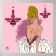 Nossa linda Bianca com cabelos loiros, vestida de branco e rosa. Bianca é enfeitada com joias e tem um fã empoeirado de rosa. Os candelabros de borgonha em um fundo de rosa claro.