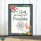 Eleve seu espaço de vida para um refúgio sem esforço com uma afirmação positiva do verso inspiracional Bíblia, Matthew 19:26. Este verso diz, "Com Deus Todas as Coisas são Possíveis" A escrita é apresentada sobre um fundo floral tropical. Este item faz parte da nossa coleção de Bíblias cristãs e pode ser comprado para inspiração pessoal ou como presente para um ente querido. Na DigitalArtfulAvenue, oferecemos uma grande variedade de itens personalizáveis e requintados que atendem às suas preferências.
