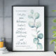 Citação de Bíblia decorativa com folhas sobre fundo branco e fonte escrita à mão. Nota importante: O quadro na imagem promovida não está incluído.