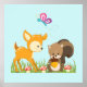 Um poster com uma ilustração fofinha com veado bebê e um pequeno esquilo segurando uma bolota e uma borboleta voando sobre suas cabeças. Estas adoráveis criaturas de floresta em pé sobre uma grama com alguns cogumelos brancos perto de seus pés. Fundo azul claro.