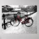 Uma bicicleta vermelha estacionada nas corridas nevadas dos rios de Uppsala, a Suecia produz uma imagem naturalmente gráfica.