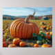 A massive pumpkin dominates the foreground of a sprawling pumpkin patch. The vibrant orange and green hues stand out under the warm light of a setting sun, with an expansive landscape in the background