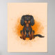 A ilustração original do desenho animado de Destei de um cão da raça Cavalier King Charles Spaniel, preto e cor-de-rosa, que está sentado. Há um salto de cor laranja atrás do cachorro.