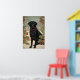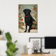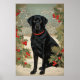 Um Labrador Retriever preto senta-se numa cena de inverno nevado, emoldurado por ramos sagrados com frutas vermelhas. O cachorro tem uma coleira vermelha e olha diretamente para o espectador com uma expressão calma e digna. O fundo apresenta uma floresta nevada com ramificações negras e uma paleta de cores suave e suave. A imagem evoca um sentido de tranquilidade e a beleza do inverno.