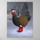 o pai natal ganhou uma galinha bonitinha como ajudante este ano - alegremente batendo com botas vermelhas e chapéu através da neve no inverno