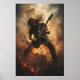 A long-haired guitarist surrenders to the music amidst dust and sparks. The dramatic movement and heat of the fire create a visceral scene of rock power, perfect for those seeking intense energy art.
