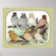 Sete pombos-loiro clássicos são mostrados em padrões barrados e lacrados. As lodinetes não têm as marcas brancas da Satinette.