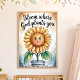 Uma ilustração aquosa de um girassol com um rosto sorridente. O girassol está num vaso cheio de água. Acima do girassol está o texto "Bloom Where God Plant You". O fundo é uma parede bege.
