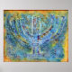 O trabalho artístico original deste menorah é uma pintura mestiça criada com tinta acrílica, pasta de modelagem e papel do artista judeu contemporâneo Meredith Gould.