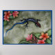 Pintura de aquarela original de Sandra Gale com um lagarto racer de cauda azul ou um skink de cinco linhas. Este pequeno lagarto é comum nos EUA e é mostrado na grama verde entre flores de plumeria rosa. design de excelente para quem ama a natureza ou passa tempo em jardins.