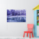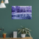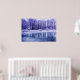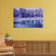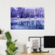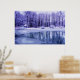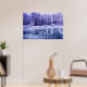 Este poster de arte apresenta uma paisagem sazonal de inverno em tons de azul, violeta, cinza, branco e roxo. As árvores estão nu. O gelo cobrir parte da água, mas lindas reflexões de árvore, nuvens e céu brilham. A neve circunda o lago.