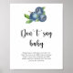 Cartão de convite para chá de fraldas em forma de grão com ilustração aquosa de mirtilos. O texto diz "um bebê doce de fruta está a caminho." Itens correspondentes disponíveis.