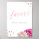 Sinal de tabletop de chá de panela com o script "Favors" com brilho rosado e design floral cor-de-água rosa. Escolha um quadro de imagem de na moda para ele e mostre na mesa de favoritos para festas.