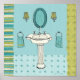 © Lisa Petty / Wild Apple. Um banheiro charmoso pintado de azul. A imagem apresenta uma pia branca, um espelho azul, toalhas de mão azul e outros sotaques.