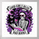 Um design vibrante e colorido mostra um esqueleto feminino lendo um livro enquanto bebe um coquetel furado. Ao redor dela estão flores roxas e borboletas, somando-se a estética viva. O texto ousado e colorido diz: "As boas meninas leem livros ruins." Esse design exclusivo está disponível em uma grande variedade de produtos.