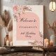 Um poster de boas-vindas para uma festa de aniversário elegante e moderna. Mármore de ouro e arco de rosa decorado com grama pampas de estilo boho, ouro de rosa e florais cor-de-rosa pincel. Personalize e adicione seu nome e idade.