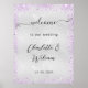 Um fundo com aspecto fino prateado, decorado com faíscas de brilho violeta, cor de lavanda e 3 borboletas como marcas d'água. Bem-vindos ao nosso casamento. Personalize e adicione seus nomes.