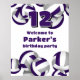 Este pôster de boas-vindas para festa de aniversário temática de voleibol é totalmente personalizável e apresenta voleibol roxo, cinza e branco dispostos aleatoriamente, nos quais você pode personalizar sua mensagem personalizada e a idade da criança, ou personalizar o texto para se adequar ao seu evento - por katz_d_zynes