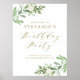 Bem-vindo a convidados para o seu evento com este sinal de boas-vindas personalizável à festa de aniversário. Apresenta um verde-aquoso e flores brancas com caligrafia branca. Personalize adicionando seus detalhes. Este sinal de boas-vindas de aniversário verde é perfeito para os aniversários de primavera e inverno.