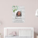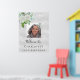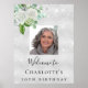 Poster de boas-vindas para uma festa de aniversário 50ª (ou qualquer idade). Personalize e adicione uma foto, um nome e uma idade. Um fundo com aspecto sujo de prata e poeira brilhante, decorado com flores brancas, rosas e verde. Para trás: sem design.