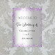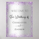 Um fundo com aparência de prata falsa, decorado com faíscas roxas. Com o texto: Bem-vindo ao Casamento de... Personalize e adicione seus nomes.