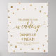 Esta poster de boas-vindas de bolinhas de casamento de de ouro é perfeita para um casamento elegante. O simples design apresenta um confete de ouro cônico sobre um fundo de champanhe cremoso com uma bela caligrafia de folha de ouro falsa. Personalize o poster com o nome da noiva e do noivo, e a data e o local do casamento. Nota: Este design não apresenta folha de ouro real. É um gráfico de alta qualidade feito para se parecer com folhas de ouro.
