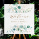 Este sinal de boas-vindas do casamento apresenta cores aquáticas pintadas de eucalipto, verde botânico e folhas de ouro com guião dourado.