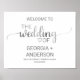 Esta simples poster de boas-vindas à caligrafia prateada é perfeita para um casamento elegante. A design de brilho prateado apresenta tipografia quic e um coração metálico luxuoso. Personalize o poster com o nome da noiva e do noivo, e a data e o local do casamento. Nota: Este design não apresenta folha prateada real. É um gráfico de alta qualidade feito para parecer folha de prata.