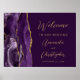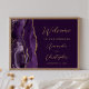 Este elegante e moderno sinal de boas-vindas do casamento apresenta uma cor d'água púrpura e borda agitada com brilho dourado. Personalize facilmente o texto dourado, com os nomes dos casais no script de escrita manual do na moda e o texto restante na fonte sans serif, em um fundo roxo profundo.