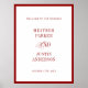 Eterno, elegante e chic sem esforço — este poster de sinal de boas-vindas vermelho é projetado para casais que adoram simplicidade clássica. Com tipografia limpa e um layout mínimo, este convite destaca seus detalhes de casamento com sofisticação e facilidade. Perfeito para casamentos modernos, tradicionais ou formais, este design emparelha lindamente com qualquer esquema de cores ou estilo de casamento.