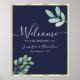 Bem-vindos à celebração da elegância do eterno e do encanto moderno. Este poster de boas-vindas azul de marinho apresenta uma mistura de elementos rústicos e botânicos com aquarela eucalipto verde e um simples e moderno roteiro de caligrafia. Perfeitamente projetado para saudar seus convidados com sofisticação e estilo.