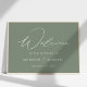 Sinal de boas-vindas do casamento elegante com "Bem-vindo" em um roteiro branco de caligrafia moderna com um fundo verde sábio (ou cor de sua escolha). Personalize a poster do casamento adicionando seus nomes e a data do casamento. A placa de boas-vindas do casamento verde de sábio foi projetada para coordenar com a nossa coleção de casamento do Modern Elegance e está disponível em outras cores.