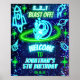 Design de aniversário dos meninos do astronauta no neon brilhante brilhando azul e verde.