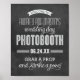 O símbolo de poster de foto de casamento personalizado do tamanho de 8 x 10" pode ser personalizado com nomes de noiva e noiva e texto de data de casamento. A placa diz "Bem-vindo ao fotobooth do dia de casamento da Noiva e do Groom, data de casamento (xx.xx.xx), Pegue um adereço e bata uma pose!". Plano de fundo do estilo do quadro de aviso texturizado preto com texto esbranquiçado.