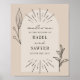 Arte botânica simples com roteiro, nomes de casais e data de casamento sobre o fundo do bronzeado com arco.