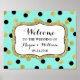 Bem-vindos ao nosso sinal de Casamento com nome personalizado e data em azul-azul-turquesa com padrão de confete preto e ouro, por favor note que o ouro é apenas efeito fotográfico.