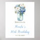 Lindo sinal de boas-vindas de aniversário com flores de peônia azuis em uma jarra de Mason. Perfeito para uma festa de aniversário. As palavras podem ser alteradas para atender às suas próprias necessidades ou requisitos