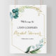 Este pôster de boas-vindas de chá de noiva com eucalipto dourado e verde é perfeito para um chá de noiva simples. O design apresenta folhas e flores verdes, douradas e azuis pintadas à mão em aquarela, elegantemente dispostas em buquês e molduras geométricas.