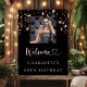 Um poster de boas-vindas para uma glamourosa festa de aniversário 50ª (ou qualquer idade). Um fundo preto clássico decorado com estrelas douradas rosa. Personalize e adicione uma foto e um nome. Bem-vindos com o coração.