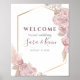 Rosas cor-de-rosa e Creme com quadro de Ouro Elegante Poster de Sinal de Boas-vindas de Casamento - apresenta escrita manuscrita cor-de-rosa empoeirada e um roteiro preto elegante com rosas cor-de-rosa pinceladas e folhas secas beges-creme em quadro geométrico elegante de ouro.