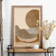 Ilustração de arte moderna Boho abstrato. Estética e simplicidade com formas texturizadas rústicas e formas de montanhas, a lua, e rios de arte contemporânea. Arte vetorial boêmica num estilo moderno e mínimo de tendências. Excelente de trabalho de arte simples e elegante. Fundo estético com paisagem solar. Cores neutras como tons da Terra, laranja queimado, cores terracottas. Decoração da parede de Boho. Arte moderna minimalista do meio século.