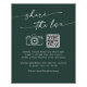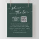 Este boho chic emerald green compartilha o sinal de código QR do amor é perfeito para um casamento minimalista. O design verde boêmico moderno da floresta de caçadores de escuros e modernos apresenta uma caligrafia rústica simples com um estilo único, porém clássico. Digite seu endereço na seção de código QR do modelo e o código QR será atualizado automaticamente e vinculado ao seu site. Personalize a placa com a hashtag de casamento para compartilhar fotos nas redes sociais.