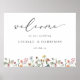 Um poster moderno de boas-vindas ao casamento com uma borda inferior de flores coloridas silvestres de cor aquática. "Bem-vindo" está na cinza do estilo caligrafia moderno. Personalize com seus detalhes de casamento. Disponível como um download.