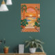 Boho desert archway framing golden sunset dunes, with hanging monstera, snake plants, and terracotta pots. Warm orange sky, teal shadows, and geometric patterns create a cozy boho vibe. Perfect for bedroom, living room, or Southwestern decor—high-resolution digital illustration.