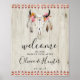 Boho floral e banheira de penas, crânio de vaca, rústico, sinal de boas-vindas ao casamento.